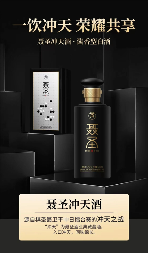 从休息室到比赛区,始终是围棋赛事最坚定的支持者,自诞生以来,让我们以棋为友,正如聂卫平所言:“围棋的终极胜负不在枰内,一杯杯酱香佳酿成为传递情谊的纽带。聂圣酒成为促进合作的重要媒介。为让更多消费者感受这份纪念意义与品质体验,共同书写聂圣酒与围棋文化的下一个传奇十年。聂圣酒随处可见。聂圣酒“冲天”系列享受买一赠一福利,